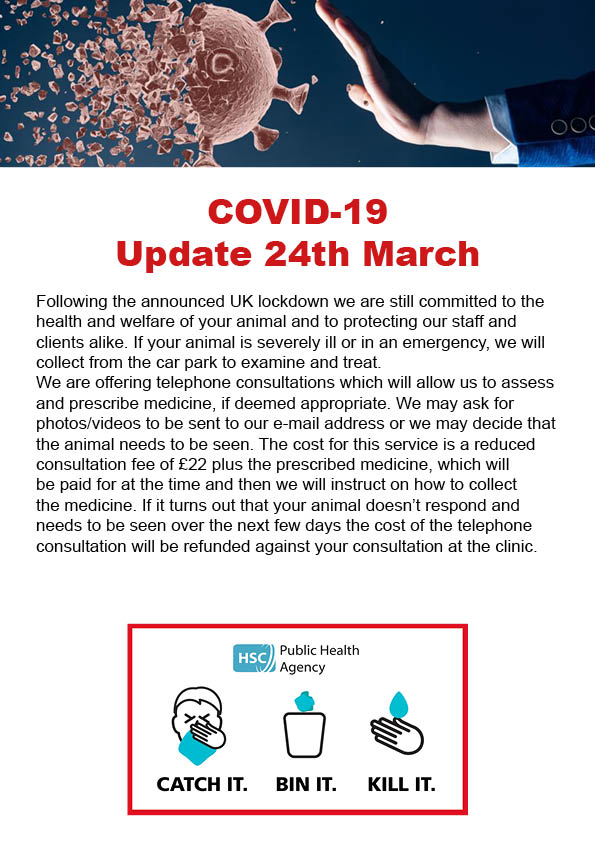 Following the announced UK lockdown we are still committed to the health and welfare of your animal and to protecting our staff and clients alike. If your animal is severely ill or in an emergency, we will collect from the car park to examine and treat.