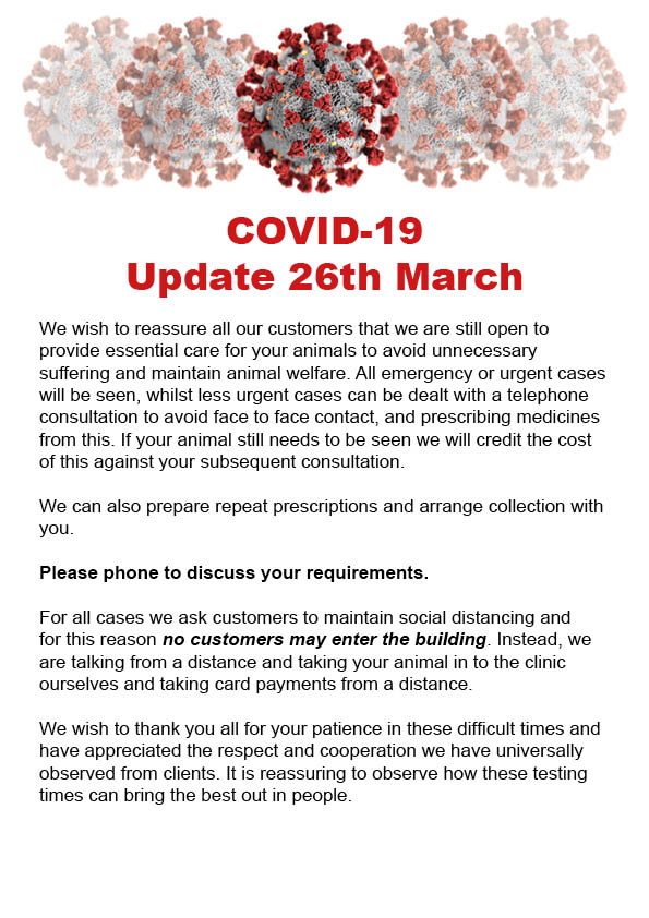 We wish to reassure all our customers that we are still open to provide essential care for your animals to avoid unnecessary suffering and maintain animal welfare. All emergency or urgent cases will be seen, whilst less urgent cases can be dealt with a telephone consultation to avoid face to face contact, and prescribing medicines from this. If your animal still needs to be seen we will credit the cost of this against your subsequent consultation.